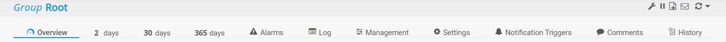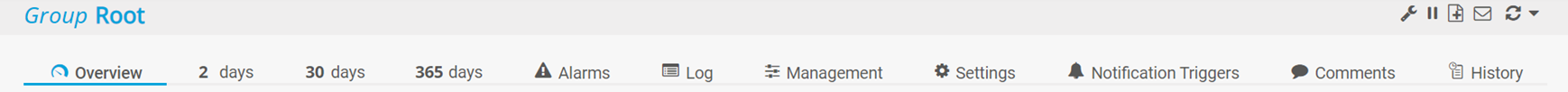 On the right-hand side, there is a row of icons for several actions. Depending on the selected page, you can Pause and Resume the object. You can also open the Settings of the object, Add a ticket, Send a link to the selected page per email, or Perform an immediate scan.