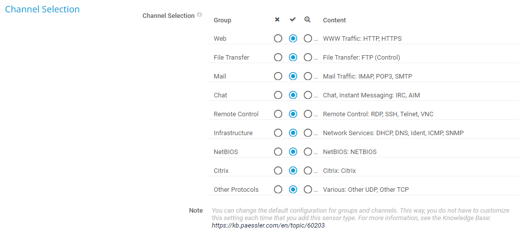 No (): Do not account traffic of this group in its own channel. The sensor accounts all traffic of this group to the default channel named Other.